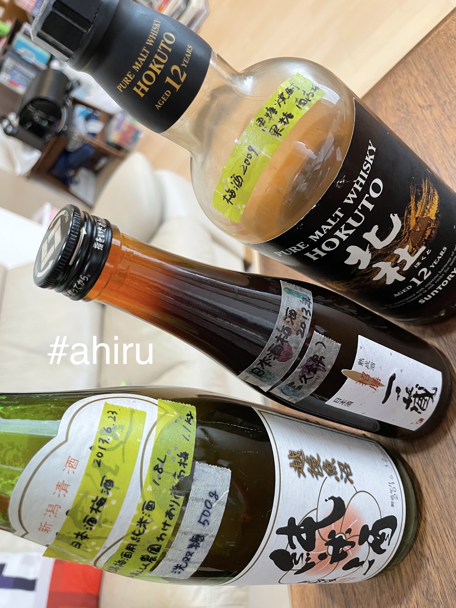 中央のびんの上の方を見ると階層になっていて、足した方が古いんだけど透明度は高いのがわかりますね。日本酒で漬けた方がアルコール度数が低いから澱が出やすかったり濁りやすかったりするのかしら。低いといっても梅酒を漬けるために調べて取り寄せた20度ある特殊な日本酒ですけども。