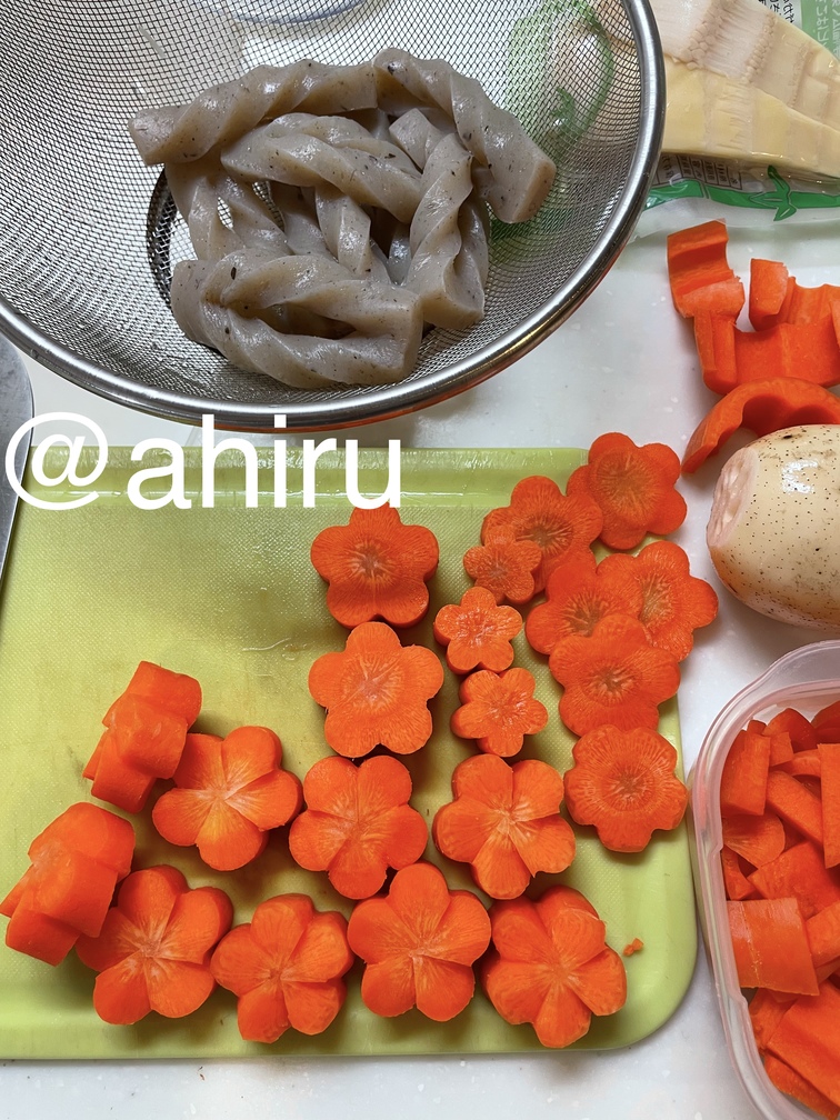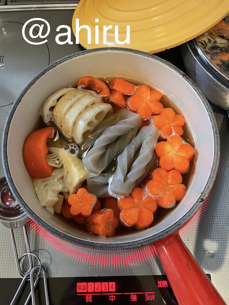 昨年のリベンジで、今年はにんじんをちゃんとねじったよ!いやおととしのリベンジで去年は、か。うちの子タロー11歳、ねじる作業もだいぶ危なげなくなってきました。ここに写ってるの全部タロー作じゃないかな?私はお雑煮野菜とか他の仕込みに専念できてとても助かりました。