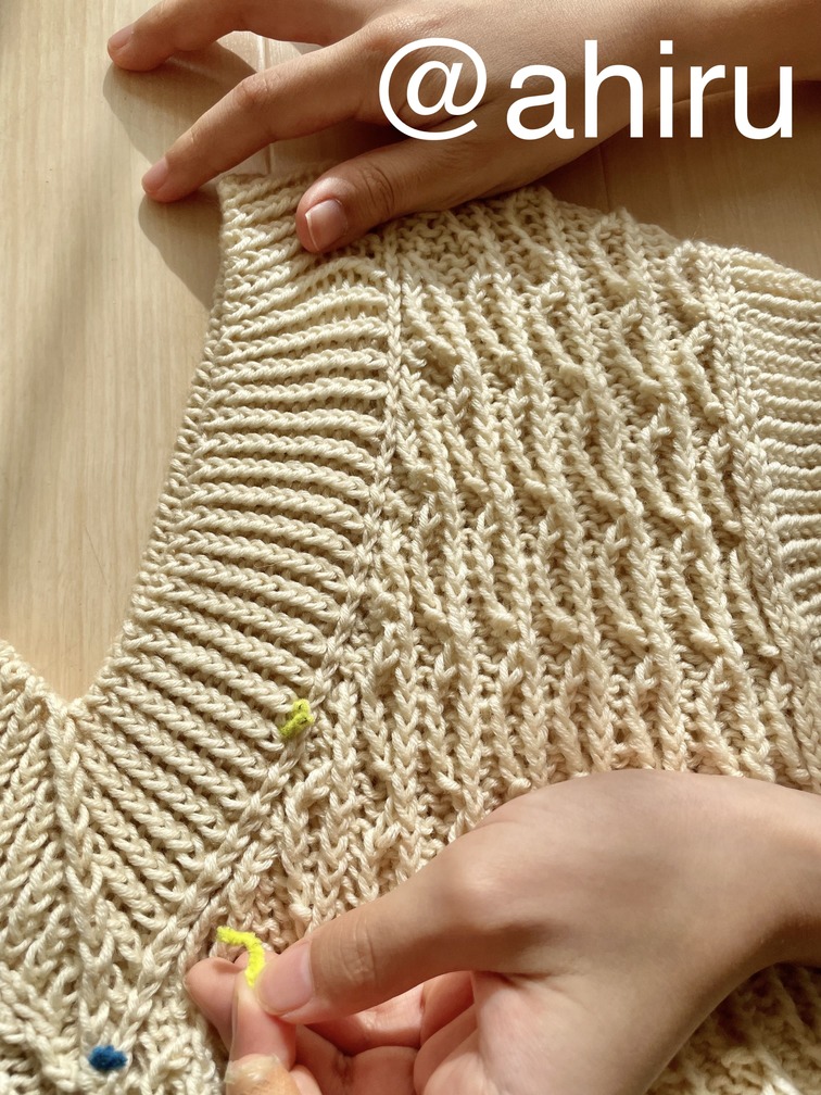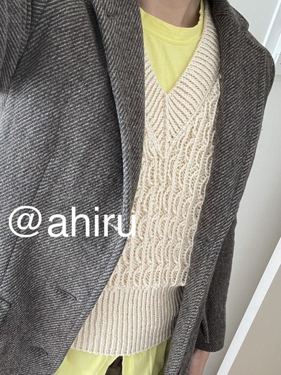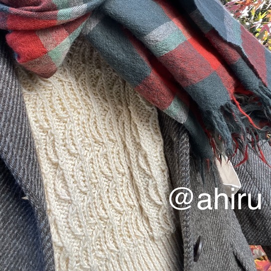 なので、これもいつものあひるちゃんニッティングの例に漏れず、何度か編み直しましたよね。えっまだきつい!?とか、いやさすがにゆるすぎた、とか紆余曲折あっての、これ!でございました。ほんとは正直ちょっと、肩幅大きくしすぎて、さらに毛糸のハリのせいでぴーんてなってて。脇を閉じてないから余計にこう、殿中でござるみがね。裃のような雰囲気出ちゃったな〜と思わないでもないのですが、もうやっとここまで完成させたからいいや!と。セーターを編む者にとって袖ぐりのゴム編みまで来たのにそれをほどくのってすごい徒労感があるのです…だからいいや…って着ています。殿中でござってる。
