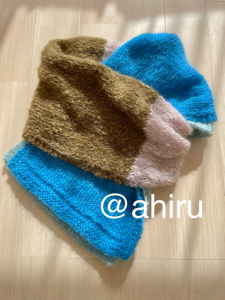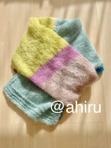 この冬、これが完成してからずっとこれ巻いてました。あったかいし明るい色味に気分も華やぐし。ただ、ほぼメリヤス編みなのでやっぱりくるんくるんに丸まって細ーくなっちゃってます。うーん。丸まり防止に端っこをガーターにしたり、飛ばし目にしたり対策してみたんだけど全然ダメですね。まあいいや。