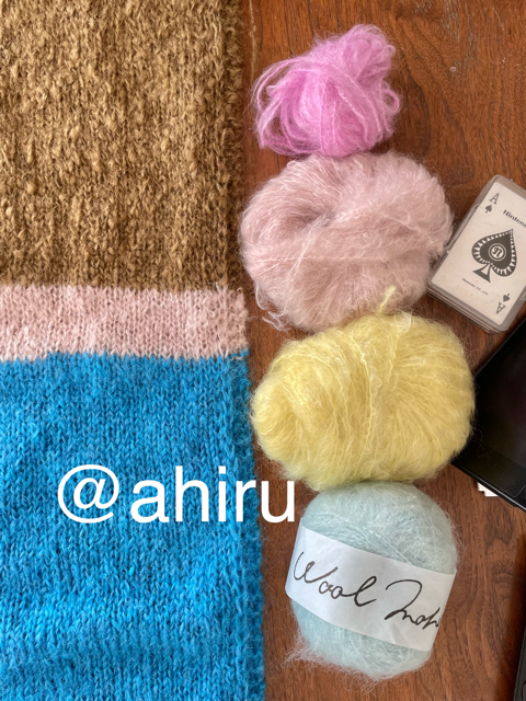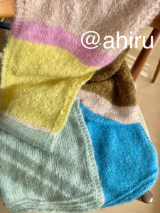えへへ。かわい〜。自画自賛。色の順番がけっこう難しくて、いざ編んでみたらなんか違う…とほどいて入れ替えたり何度かしました。あと残り毛糸が少ない「アイスグレープ」(ドルマンセーターにも使ったラベンダー色)のグラム数を計って、差し色の「ベビーピンク」が同じ幅になるように調整したりもしました。