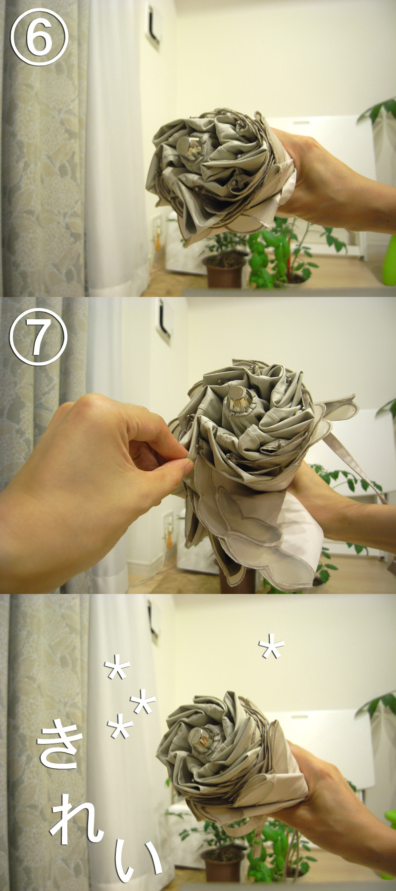 7:傘のおしり部分(中心部)の布も折り目に沿ってちょいちょいと整えていく。